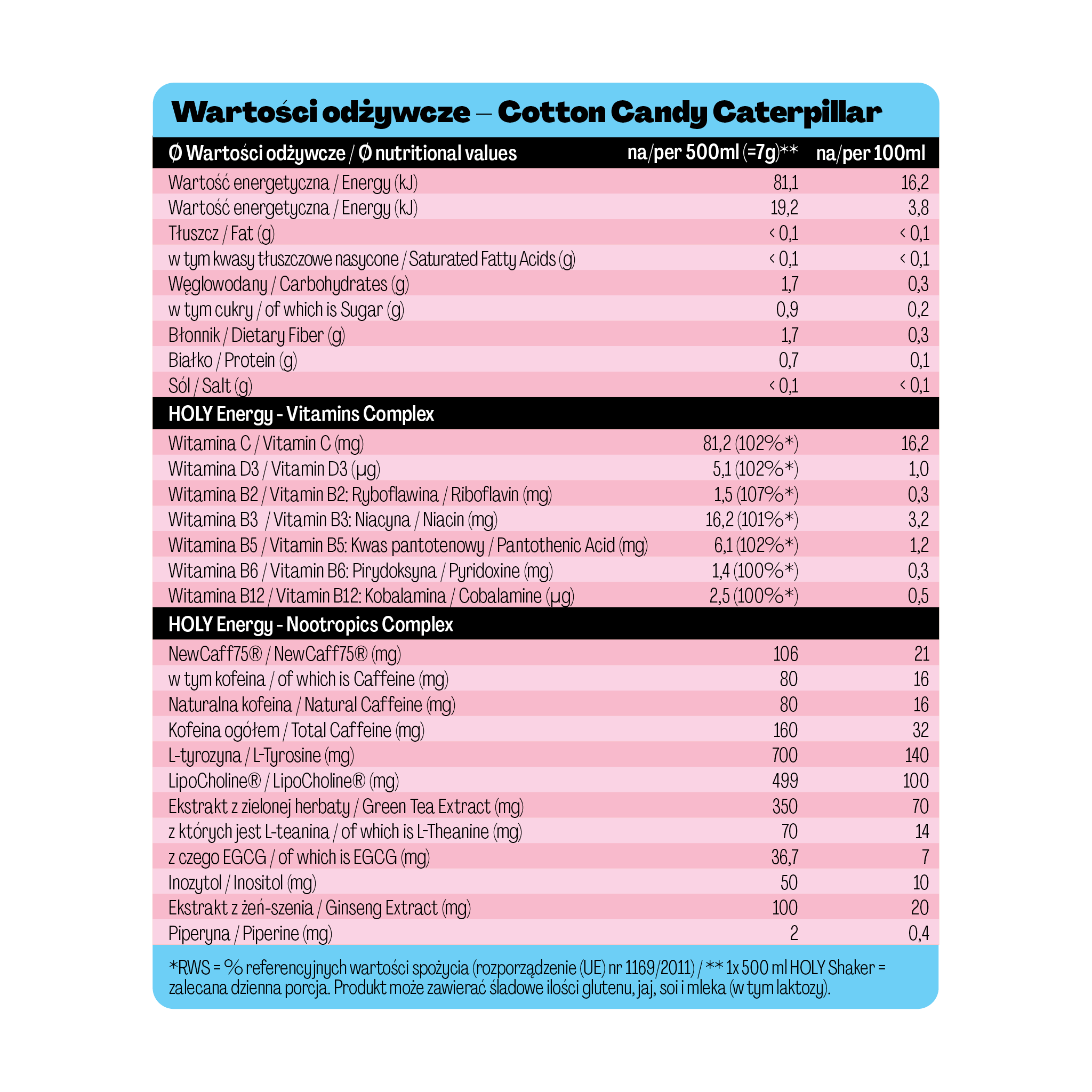 HOLY zawiera mniej niż 0,4 g cukru i mniej niż 20 kcal na 500 ml - popularne energetyki na rynku europejskim mają około 50 g cukru i 220 kcal na 500 ml.