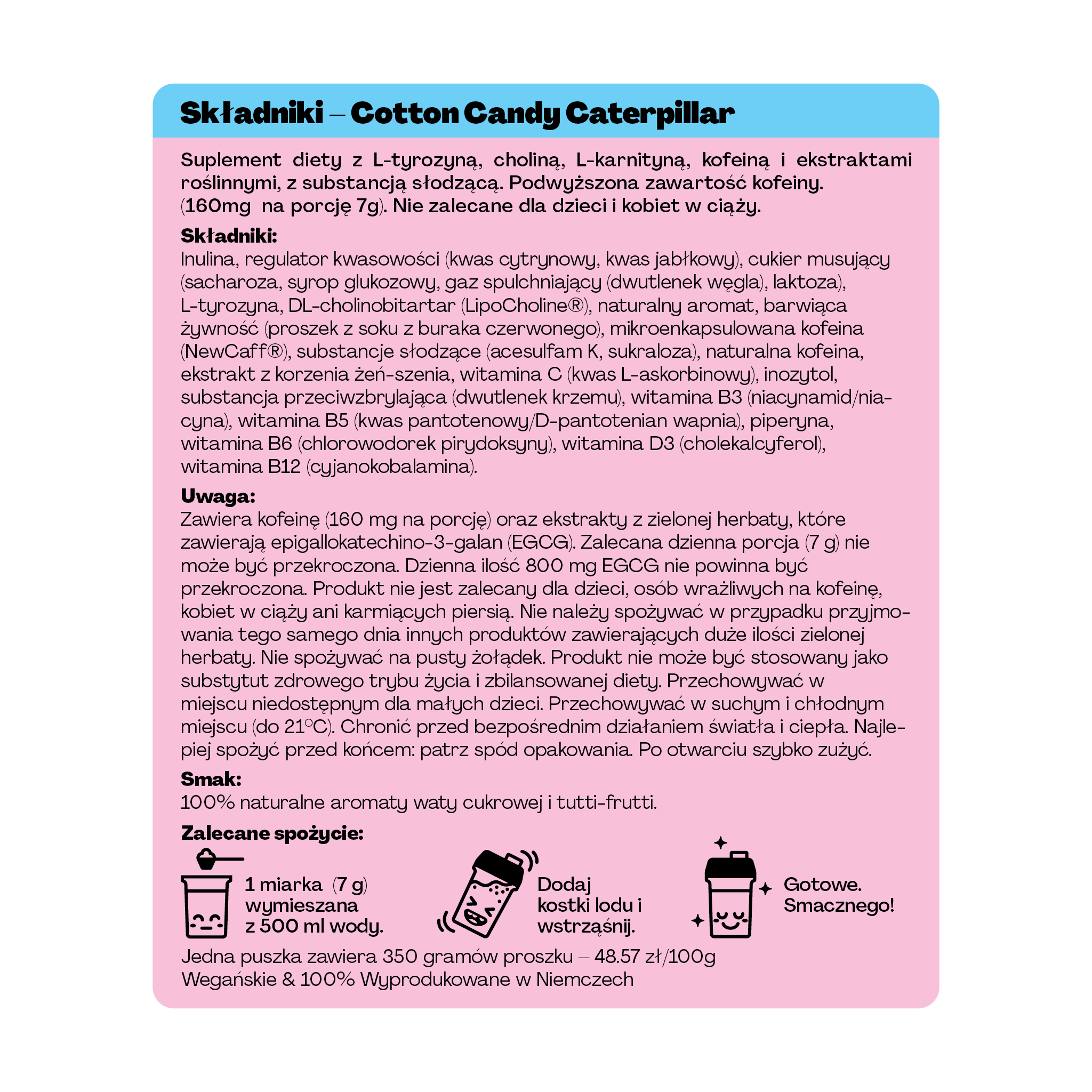 HOLY nie zawiera sztucznych aromatów ani wątpliwych składników, takich jak tauryna. HOLY zawiera wiele witamin i nootropów, które według licznych badań poprawiają koncentrację i wydajność. Mikrokapsułkowana kofeina NewCaff™ jest uwalniana przez 4 godziny i zapewnia długie i stabilne pobudzenie!