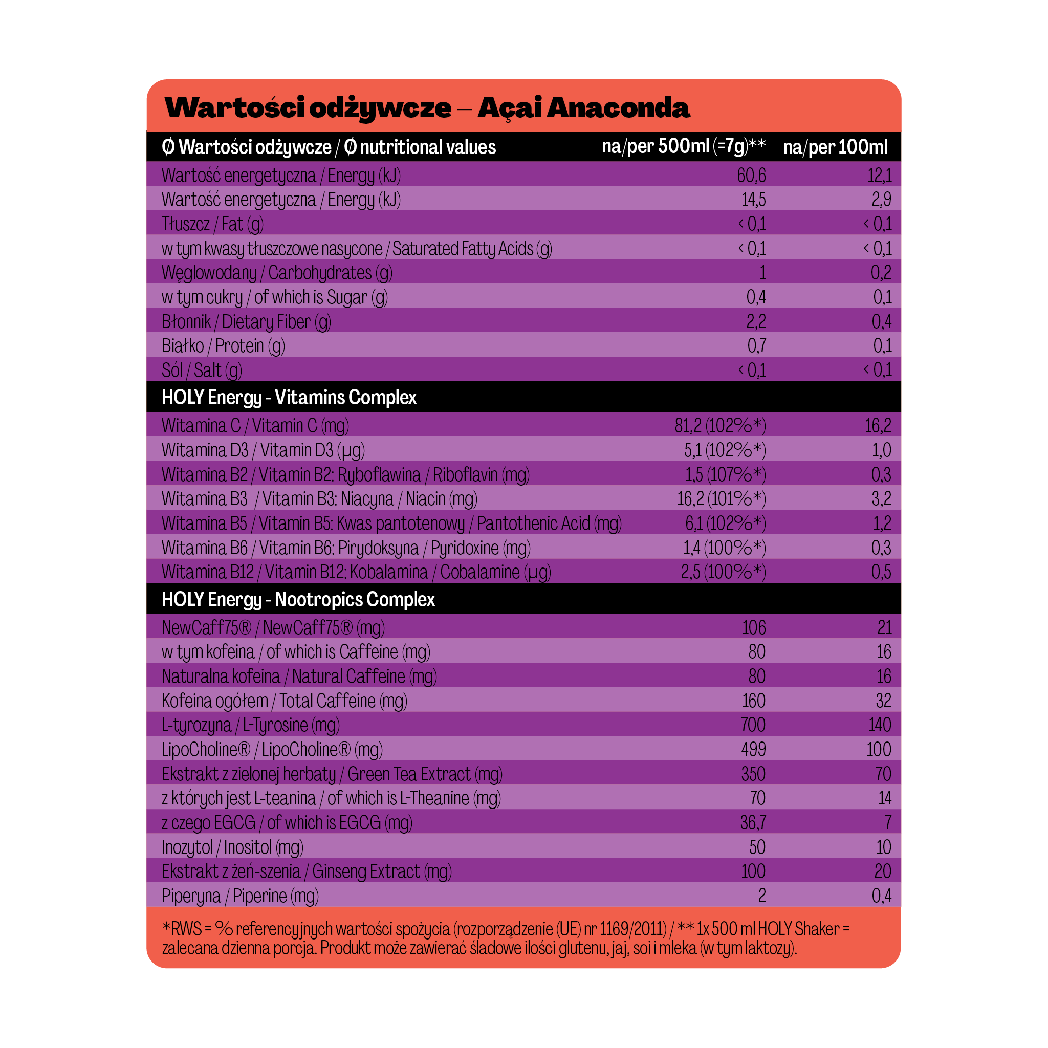 HOLY zawiera mniej niż 0,4 g cukru i mniej niż 20 kcal na 500 ml - popularne energetyki na rynku europejskim mają około 50 g cukru i 220 kcal na 500 ml.