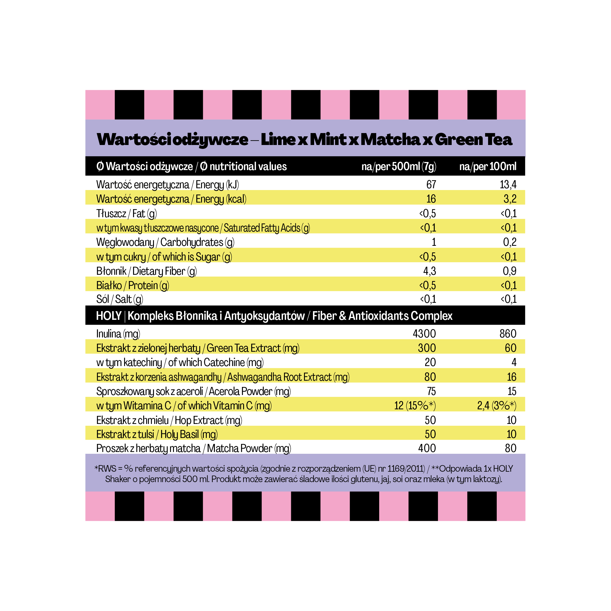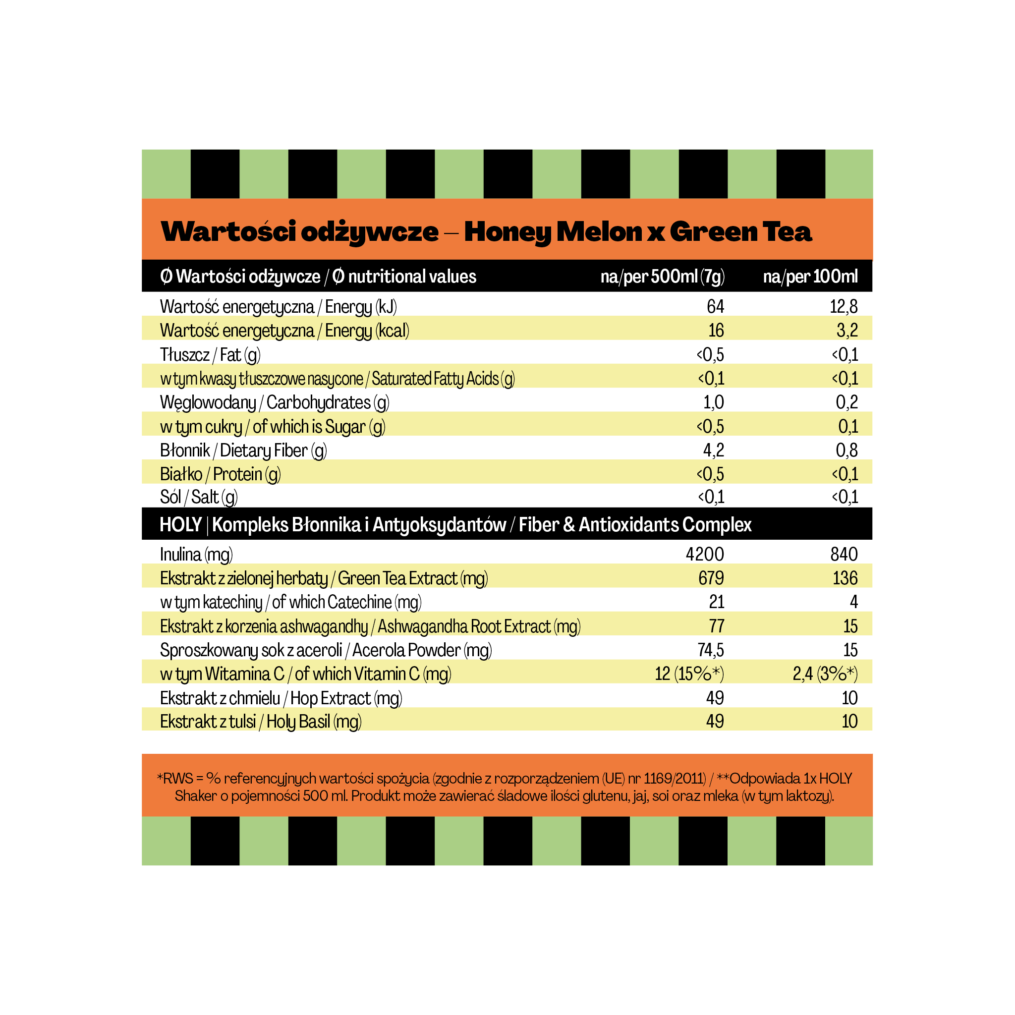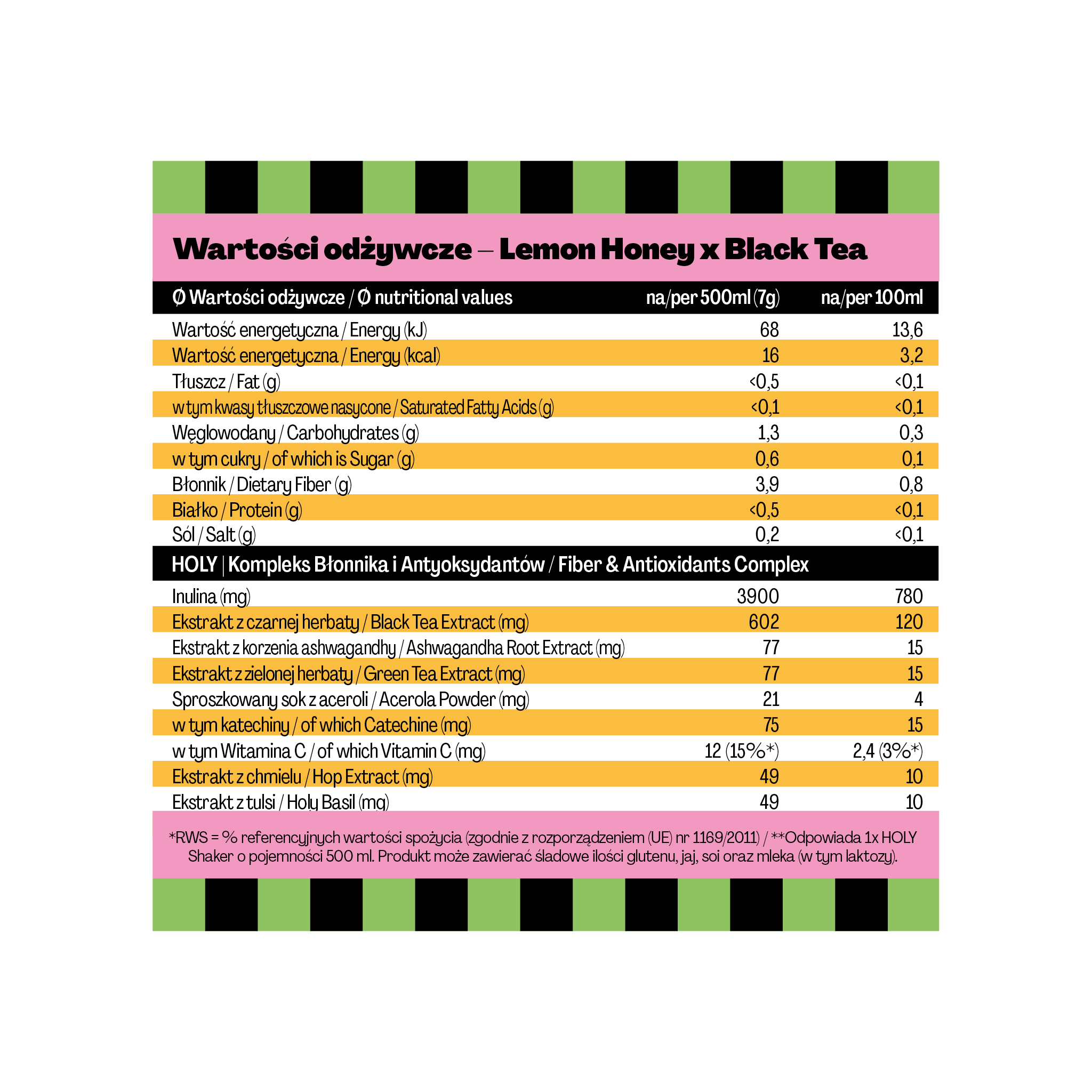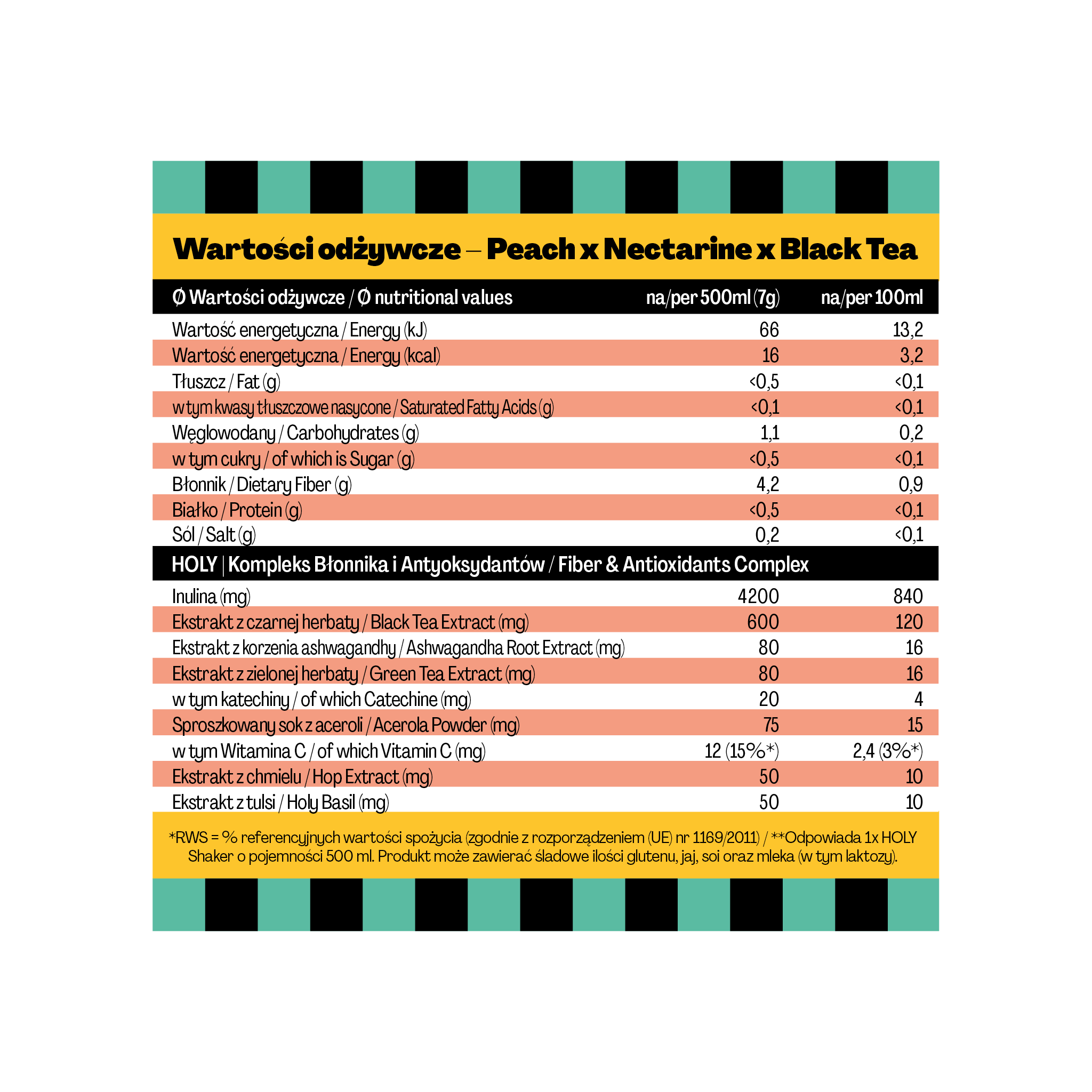 HOLY zawiera tylko 0,5 g cukru na 500 ml i mniej niż 20 kcal na 500 ml - konwencjonalne Ice Tea mają około 40 g cukru i 165 kcal.HOLY nie zawiera sztucznych aromatów, sztucznych barwników ani wątpliwych składników.