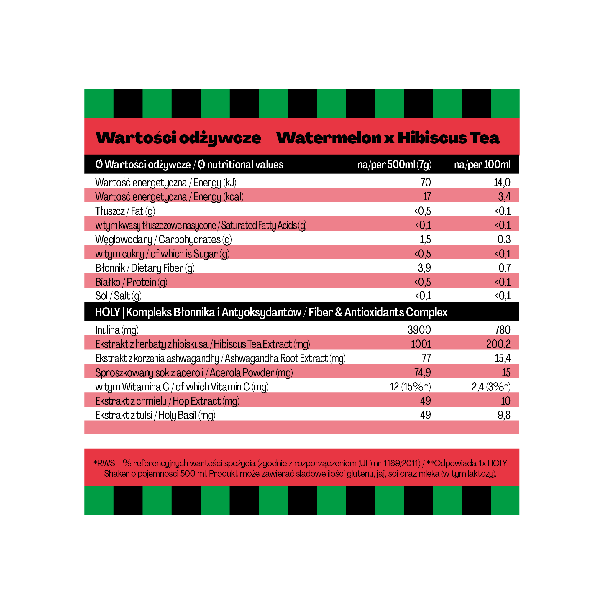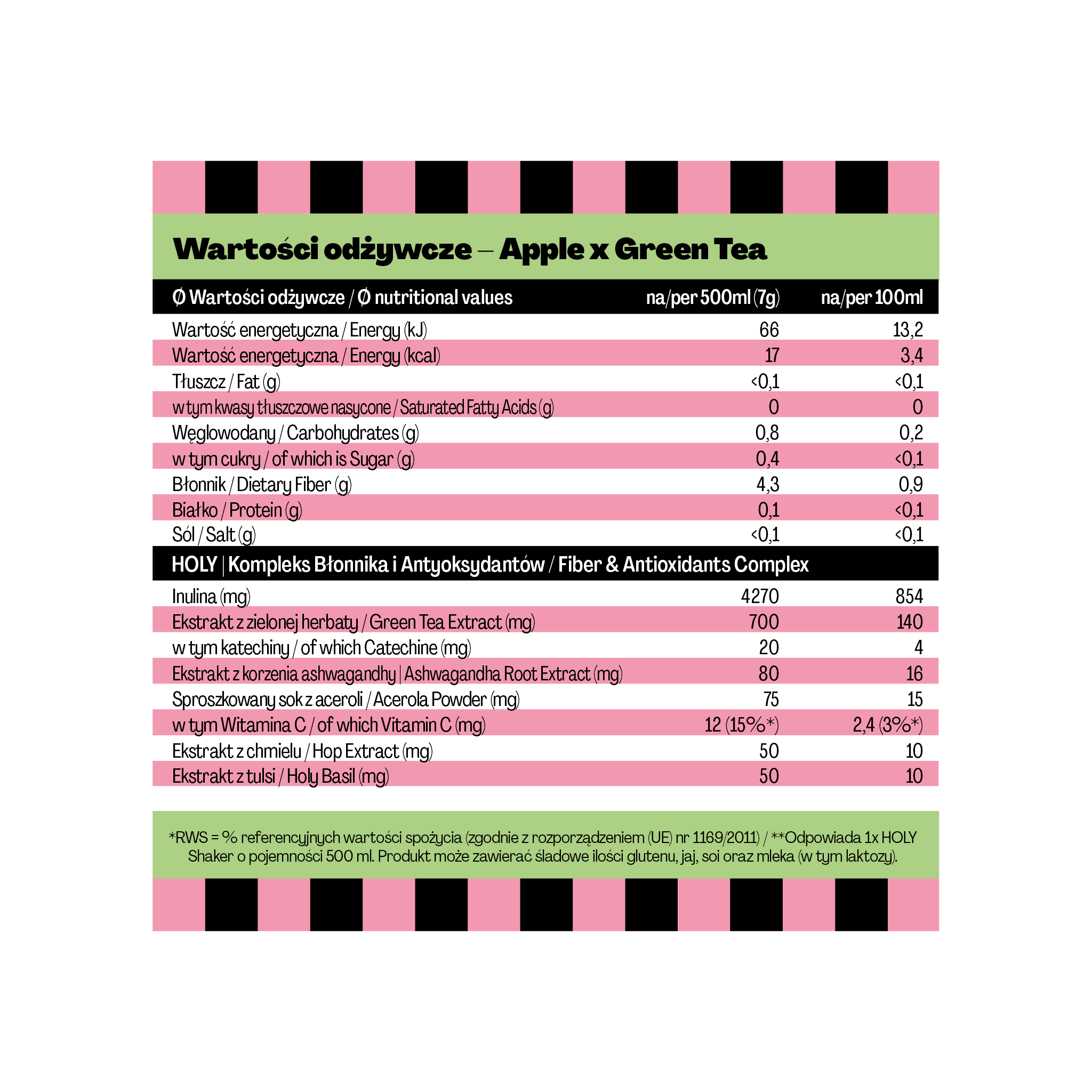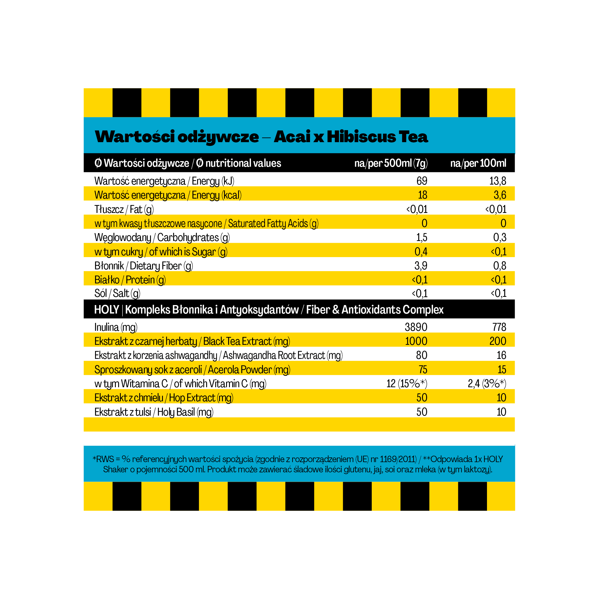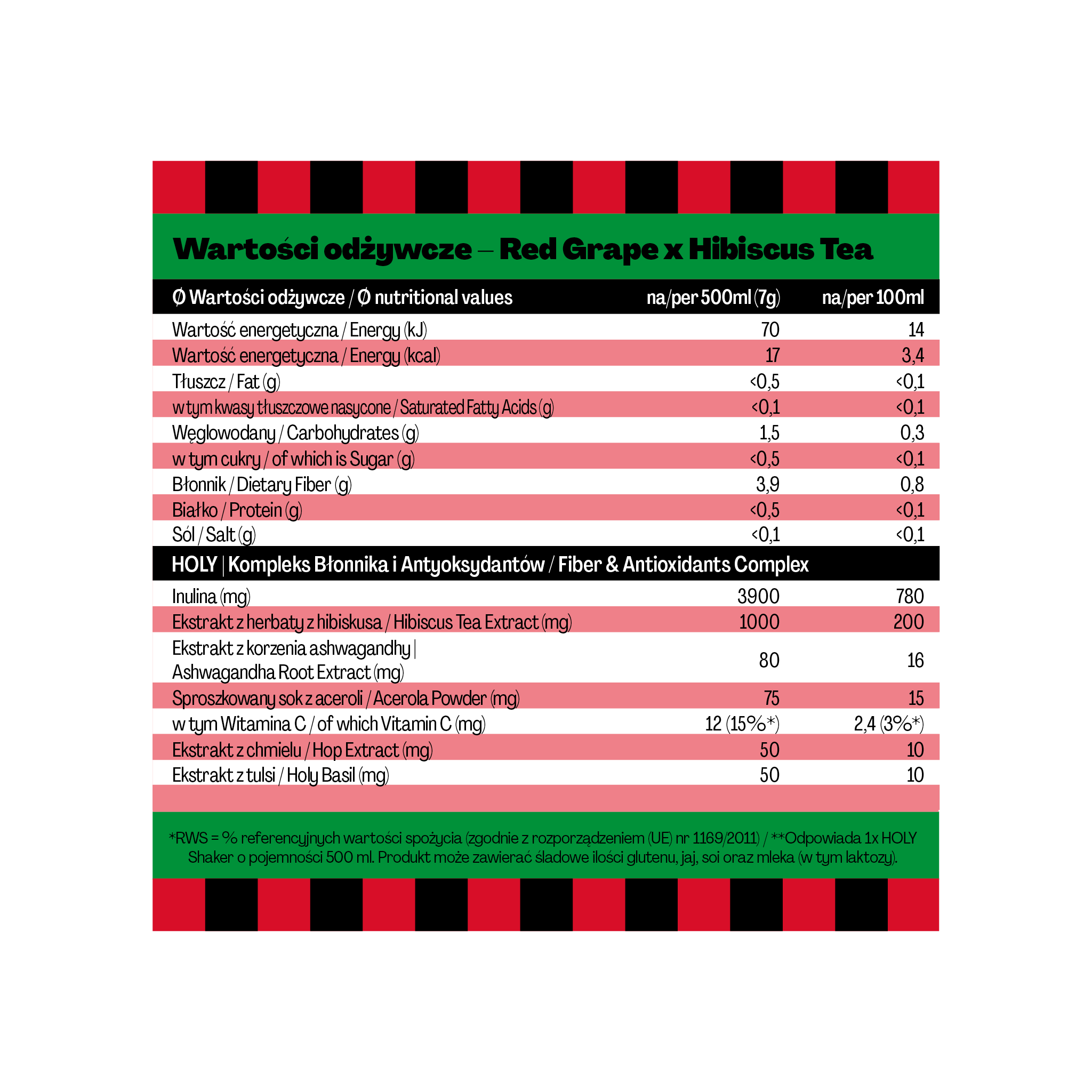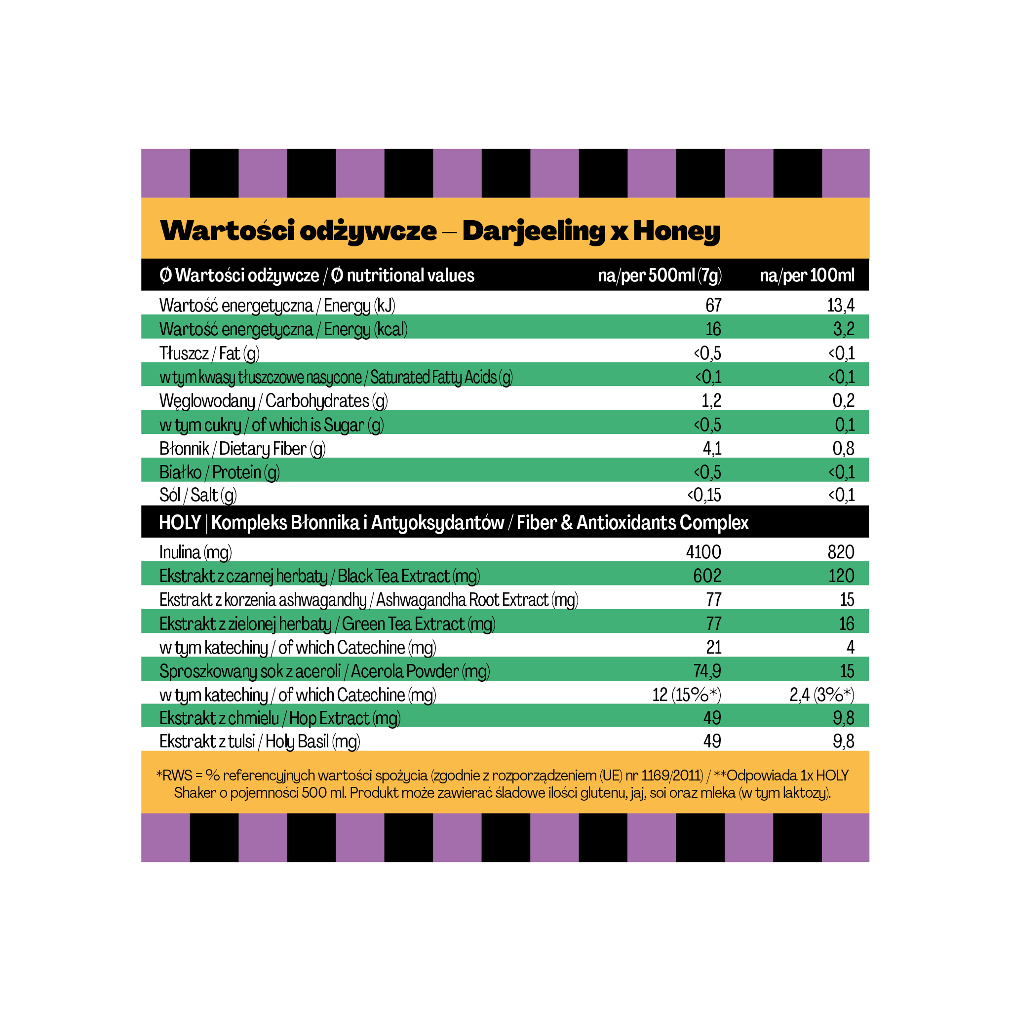 HOLY zawiera tylko 0,5 g cukru na 500 ml i mniej niż 20 kcal na 500 ml - konwencjonalne Ice Tea mają około 40 g cukru i 165 kcal.HOLY nie zawiera sztucznych aromatów, sztucznych barwników ani wątpliwych składników.